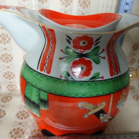 Venäläinen posliininen teekannu, jossa käsinmaalatut moniväriset kukkakuviot ja kultakoristeita. Kannussa on kaareva kahva ja pitkä nokka, molemmat vaaleanruskeat ja koristeltu väripilkuin. Kansi on irrotettava ja siinä on nuppimainen kahva. Koko on pieni–keskikokoinen, mittakaavana kuvassa tulitikkuaski. Soveltuu teen tai muiden kuumien juomien tarjoiluun sekä sisustusesineeksi. Lehtikullatut koristemaalaukset. Korkeus 15 cm ja leveys 19 cm. Hyvässä kunnossa. Voin lähettää. Mmm.