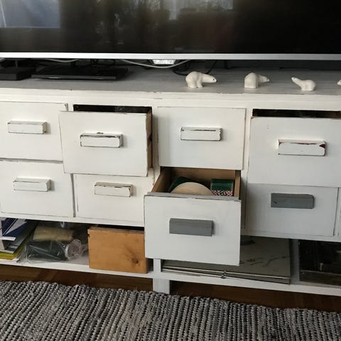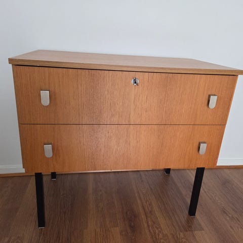 Hyväkuntoinen vanha teak TV taso, jonka pinta on öljytty ja pyörät huollettu. Runko maalattu.