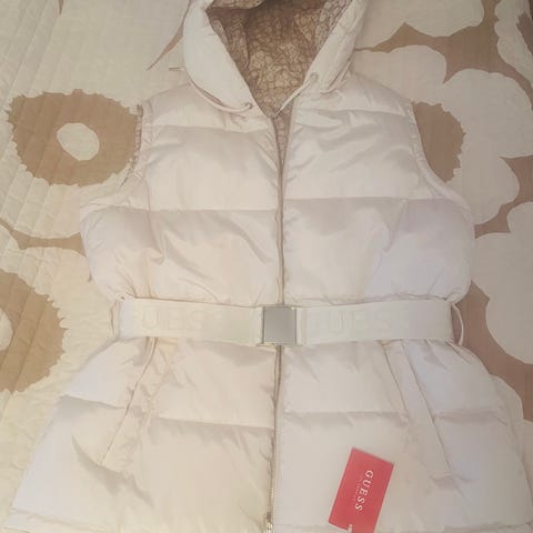 Guccin musta toppaliivi jossa harmaa fleecevuori ja irroitettava huppu, sivuilla taskut, sisällä vuoressa silkkinen povitasku. Koko L, niska-helma 67cm, kainalo-helma 40cm, kainalo-kainalo 50cm. Pari kertaa käytetty, muttei mitään käytönjälkiä, kuin uusi ja täydellisessä kunnossa.