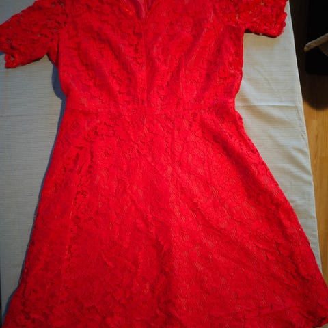 Marks & Spencer musta pitsimekko, koko 38. Kerran käytetty. Mekossa on lyhyet hihat ja polvipituinen helma. Yläosa on istuva ja helmassa on kevyesti levenevä malli. Takana vetoketju ja hakanen pukemisen helpottamiseksi.