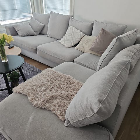 Juuri torista ostettu. Mutta valitettavasti onkin hieman liian suuri ja väärän värinen omaan makuun. Aikaisemmassa myynti-ilmoituksessa mainostettiin harmaata sohvaa, toisten silmään sohva ilmeisesti on enemmän harmaampi mutta omaan silmään oman kodin valaistuksessa näyttääkin enemmän ruskealta.