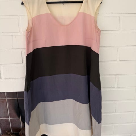 Kevyt ja miellyttävä puuvilla–silkki mekko. A-linjainen malli, pyöreä pääntie ja lyhyet raglanhihat. Helma ulottuu noin säären puoliväliin.