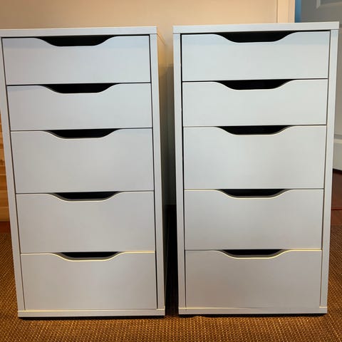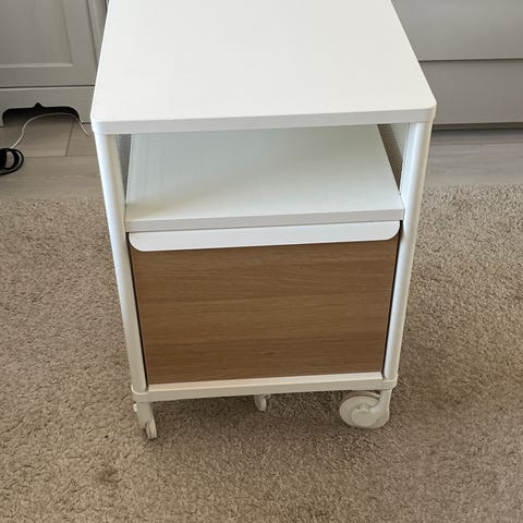 Valkoinen Ikean Alex laatikosto 5 laatikolla. Meillä ollut kirjoituspöydän alla, siitä kannessa vähän jälkiä, ks. kuvat.