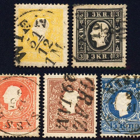 Itävalta, 1850–1922, siisti erä parempia klassisen ajan merkkejä, mm. paremmat leimat, punaiset leimat, Abklatsch, paremmat sanomalehtimerkkejä ja malleja, lentopostia 1922, jne., kaikki moitteettomassa säilytyksessä, ANK = 900 € +