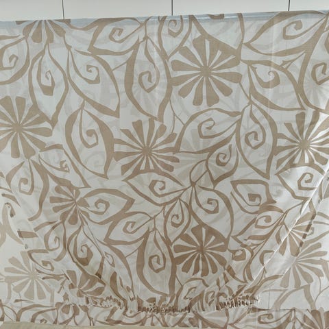 142x222cm leikattu itselle sopivaan pituuteen ja reuna siistitty liimanauhalla. Yhdestä kulmasta liimaus irronnut (kuva). Juuri pestyt, ei silitetty. Kuivatan nyt niin ettei taitoksia jää. Säilytyksestä jääneet taitokset eivät oienneet pesussa (kuva)