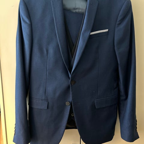 Dressmann tummansininen miesten kolmiosainen puku. Materiaali pääosin Villa-polyesterisekoitus. Ollut vain pari kertaa käytössä ennen kuin jäänyt pieneksi.