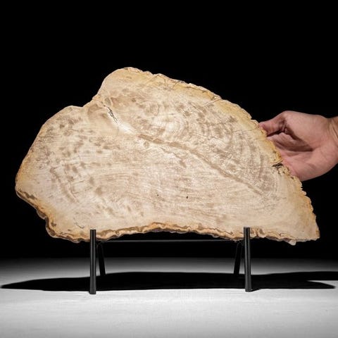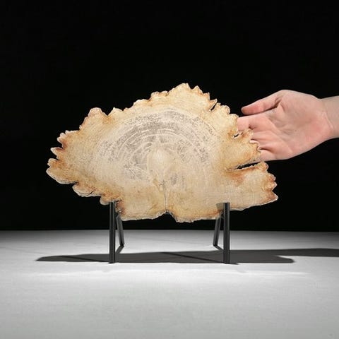 Wonderful slice of petrified wood on a custom stand.Petrified Wood is a mineralized piece of a tree that originated because trees fell over and were covered under a layer of soil or sand. Often due to a natural disaster. The colors you see in Petrified Wood depend on the Minerals in the soil or sand. Each mineral creates its own color. The process of '' petrification '' ensures that all characteristics such as knots, bark, and annual rings of the wood are preserved. A possibly decaying process in a distant past can provide for wonderful crystal formation, often in multiple colors.APPROXIMATE DIMENSIONS - including standHeight: 23.5 cm, Width: 31.5 cm , Slice Thickness: 2 cmAPPROXIMATE DIMENSIONS - Stone only: Height: 18 cm, Width: 31.5 cm, Slice Thickness: 2 cmDISCLAIMERS: - Please be aware these image has been taken in a dark studio, colors may vary depending on the environment.- THE WEIGHT MENTIONED IS INCLUDING PACKING MATERIAL.THE SHIPMENT- The item will be sent with a Track & Trace code via DHL Parcel, DPD or postNl. The tracking will be updated in your Catawiki lot once your parcel has been dropped off. - Please check regularly to avoid your parcel being returned to us, in which case the buyer will be responsible for the shipping costs of the 2nd shipment.- For tracking to Spain and Portugal please use this link and add the tracking number from your Catawiki lothttps://clientesparcel.dhl.es/LiveTracking/HomeWE DO NOT COMBINE SHIPPING!!!If you have any questions about your parcel please contact us using the Catawiki message service. We will try to reply within 3 working days.