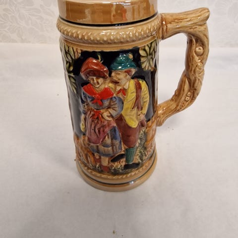 Koristeellinen keramiikkainen olutkolpakko. Kolpakossa on kohokuvioitu värikäs aihe, jossa on ihmishahmoja, maisemaa ja linna-aiheita. Kahva on muotoiltu puunoksaa muistuttavaksi. Sopii juoma-astiaksi tai sisustuselementiksi esimerkiksi kokoelmaan tai koristekäyttöön. Korkeus ja tilavuus eivät käy ilmi kuvista.korkeus 14 cm japanilainen