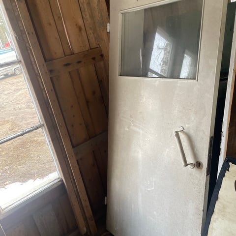 Puuovi, jossa yläosa lasia ja alaosassa umpinainen paneeliosa. Ovi on paneeli-ovi on ollut sisätiloissa käy hyvin esim. välioveksi ja on väriltään valkoinen. Varustettu painikkeella. Sopii esimerkiksi terassin, kuistin tai piharakennuksen ulko-oveksi ei ole lukkoa. Ei ole karmia. Mitat 80x 190.