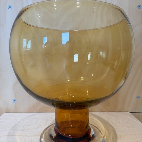 Erkkitapio Siiroisen Riihimäen lasille suunnittelema Barokki-sarjan keltainen jalallinen tarjoilumalja. Tuotannossa v. 1967-69. Mitat: korkeus 18 cm, halkaisija 20 cm ja tilavuus 1,5 litraa.