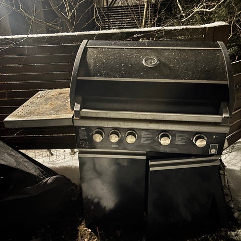Kaasugrilli, jossa useampi poltin ja sivukeitin. Grillissä on suljettava kansi sekä lämpömittari kannessa lämpötilan seuraamista varten.
