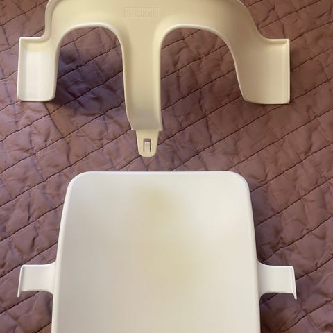 Valkoinen tarkotin Tripp Trapp -tuoliin. Mielestäni ihan ok kunnossa, yleisilme siisti. Reunassa muutama isompi naarmu, ja pöytäosassa pientä naarmua/kulumaa kauttaaltaan. Lisäksi jotain pientä värjäymää tomaatti- ja porkkaruuista, voisi ehkä lähteä auringossa.