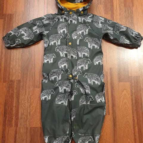 Ihana kirsikkakuvioinen fleece-vuorillinen kurahaalari koossa 92. Todella hyvässä kunnossa, en löytänyt kulumaa polvista tai pepusta. Jalkalenksut puuttuu ja yksi napeista korvattu jollain jämänapilla. Myös ripustuslenksu on katki.