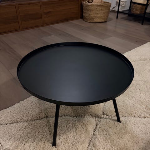 Tumman violetti sivupöytä ja alatasona harmaa koristetarjotin. Olleet lasitetulla parvekkeella käytössä. Siistissä kunnossa. Kannen halkaisija 47cm, korkeus 51cm.