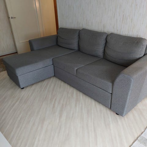 Vihreä divaanisohva. Ehjä ja siistissä kunnossa, kankaassa käytöstä tullutta nukkaantumista. Divaanin kätisyys vaihdettavissa. Ostajalle lähtee mukaan osiin purettuna, mutta helppo laittaa takaisin kasaan.