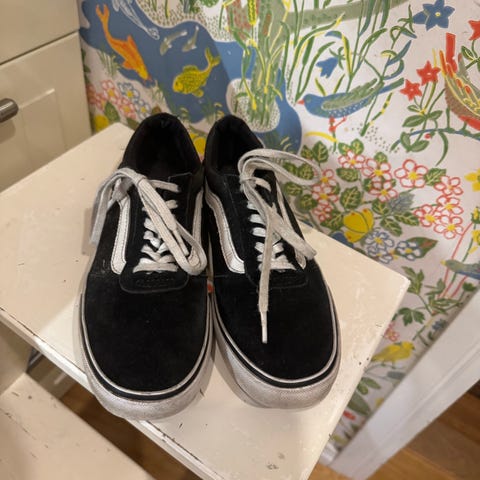 Hyväkuntoiset, mustat Vansin tennarit, koko 36,5. Pientä käytön jälkeä, valkoiset kumiosat likaantuneet, kantapäät ehjät.
