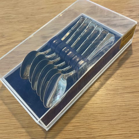 Sinisessä rasiassa olevat lusikat ilman kaiverruksia. Punaisen rasian lusikoissa kaiverrus M&V. Molemmat rasiat yhteensä 200€