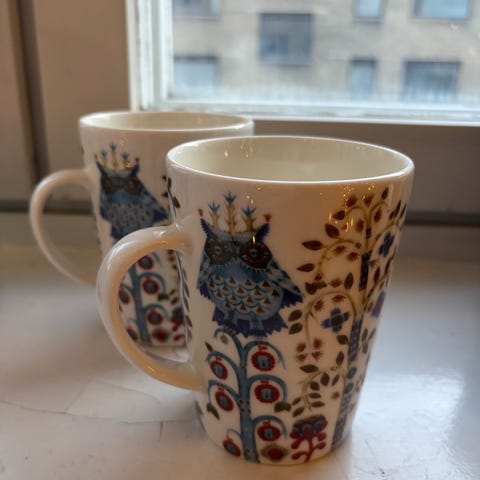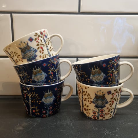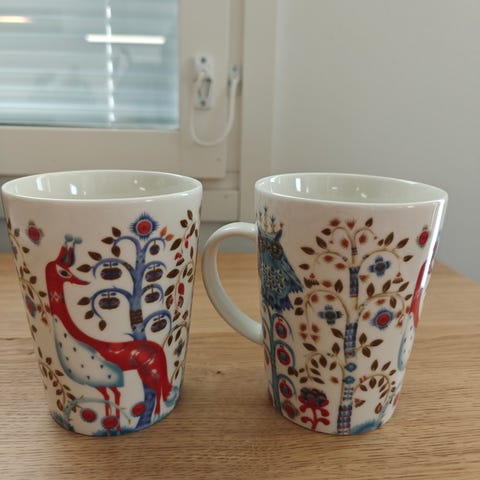 4 kpl Iittala Taika 4dl kahvimukit, tummansininen kuvionti. Hyvässä kunnossa ja siistit. Yhdessä mukissa on hyvin pieni lohkeama reunassa, joka näkyy kuvassa.