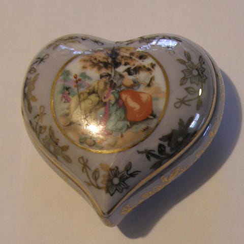 Puinen kolmiosainen (kaksi rasiaa ja kansi) koristekaiverrettu ompelurasia 1960-luvulta. Korkeus 11 cm, leveys ylhäältä 8,5 ja alhaalta 6 cm.