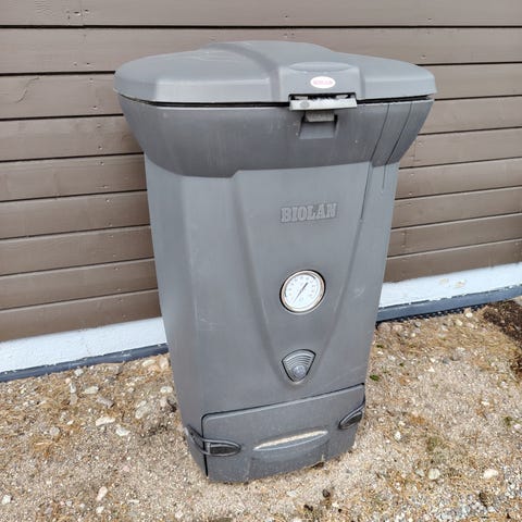 Uusi omassa paketissaan oleva Aerobin lämpökompostori. Väri oliivinvihreä. Kulkeutuu sopimuksesta Tampereen Lielahteen.