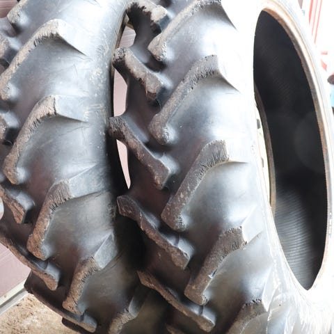 Fordson/nuffield vanteilla olevat renkaat, toinen täydellä pinnalla, toinen kuluneempi.