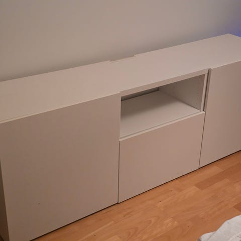 Taso ostettu Sotkasta. Valkoinen runko ja mustat laatikot. Tasossa on avoimia hyllyjä medialaitteille sekä vetolaatikot säilytystä varten. Soveltuu televisiolle ja muille viihdelaitteille sekä yleiseen säilytykseen olohuoneessa tai muussa oleskelutilassa.