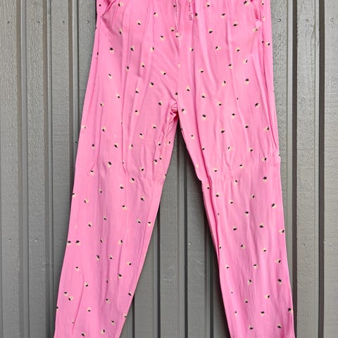 H&M vaaleanpunaiset ohuet viskoosihousut, koko 140 (ei kokopitkät enää vajaa 140 senttisellä). Voi hyvin käyttää vajaamittaisena culottes-mallina myös. Vilpoisaa, pehmeää viskoosikangasta, kimaltelevia perhosia. Siistit. Savuton ja karvaton koti.