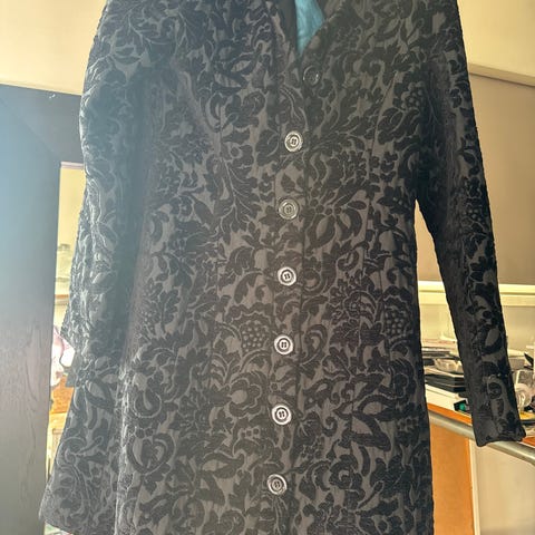 Desigual naisten takki, koko 42, vastaa enemmän kokoa 38/M. Takki on valmistettu kankaasta ja siinä on monivärinen, kirjava kuosi. Malli on polvipituinen, pitkähihainen ja edessä on napitus. Sisäpuolella on vuori ja koristeellinen painettu kangas. Sivussa pienet taskut. Korkea kaulus, jonka saa taitettua matalaksi. Sopii käytettäväksi arkitakkina tai siistimpänä päällysvaatteena viileämpiin säihin.