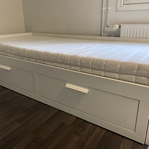 Myydään valkoinen Ikean Brimnes sohvasänky. Ollut vierashuoneessa ja käytetty vain pari kertaa. Sisältää patjat. Kaksi säilytyslaatikkoa.
