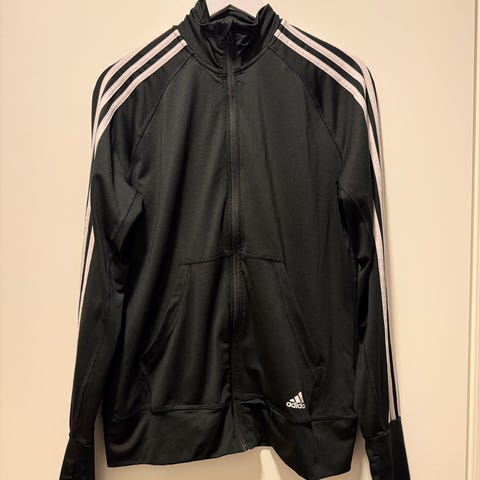 Väri tummansininen, olkapäillä ja hihoissa vaaleat Adidas-raidat. Edessä vetoketju koko pituudelta ja pieni vetoketjullinen tasku helmassa. Rinnassa Adidas-trefoil-logo. Sopii vapaa-aikaan ja kevyeseen urheiluun.