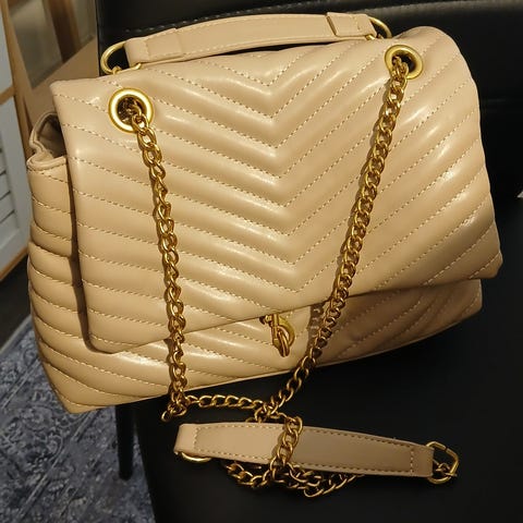 Kiva, vaaleasävyinen olkalaukku tummanruskein somistein ja hihnalla. Sisällä lokeroita.