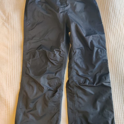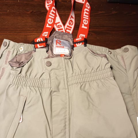 Reiman välikausihousut henkseleillä. Housun yläosa ulottuu korkealle ja suojaa tuulelta. Takapuoli ja polvet pehmenneet, mutta ehjät. Toimivat vielä hyvin rymyhousuina.