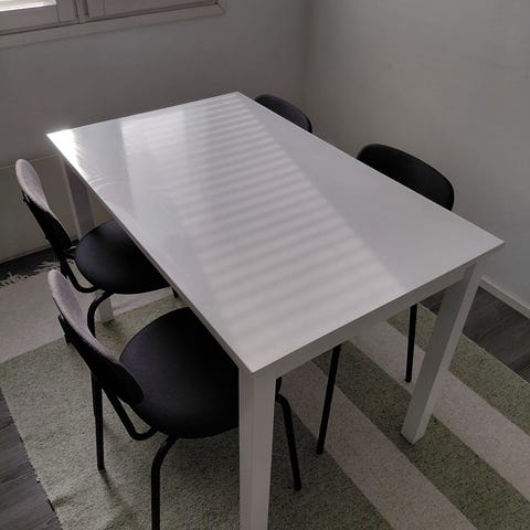 Myydään isomman pöydän tieltä 4 hengen ruokapöytä ja tuolit. Pöytä ja tuolit ovat tukevat. Käytön jälkiä näkyy ja pöytä levyyn laitettu dcfix koska pöytä levy tarviis hionnan.