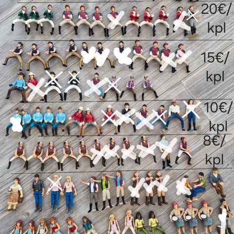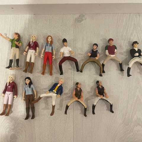 Hyväkuntoisia Schleich ratsastajia, hinnat 8€-23€, lukevat kuvateksteissä.