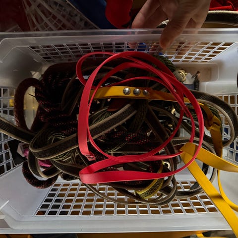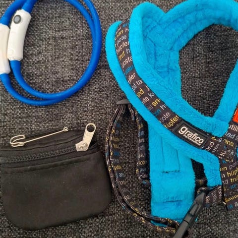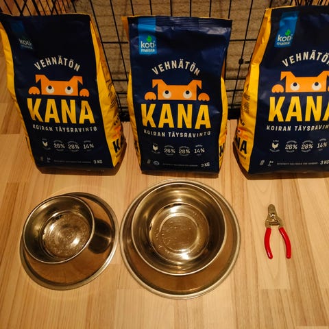 Koirantarvikesetti, johon kuuluu erilaisia koiran perushoitoon ja ulkoiluun liittyviä tuotteita. Kuvassa näkyy koiran valjaita, talutushihnoja, ruokakuppi, koiranhoitoharja, kynsisakset, pesuainepullo sekä pehmeitä leluja. Setti soveltuu koiran ruokailuun, ulkoiluun, leikkiin ja perushoitoon. Pienen koiran valjaat.