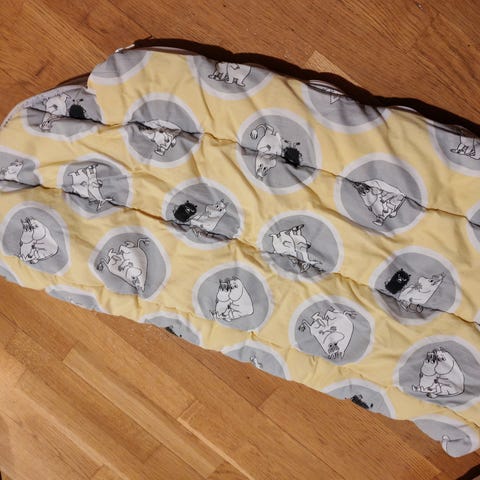 Ihana keltainen Familonin Muumi makuupussi. Ei enään uuden muhkea, muttei kuitenkaan mikään puhkipesty liprukka. Ehjä ja siisti. Ollut säilytyksessä vaatehuoneessa jossa tullut pieni tahra.
