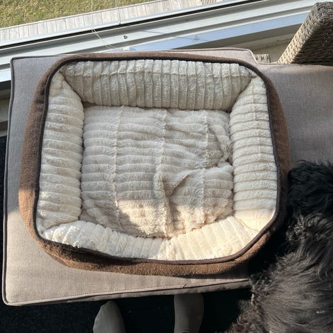 Oranssi lemmikin peti, jossa harmaat reunat ja korotetut laidat. Pehmeä makuualusta ja pehmustetut sivut tarjoavat rajatun ja suojaisan lepoalueen. Materiaali vaikuttaa olevan helposti pyyhittävää kangasta.