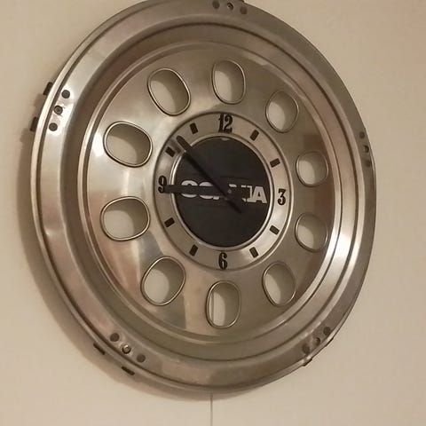 Scania aiheinen puinen seinäkello. Koneiston kunnosta ei tietoa.