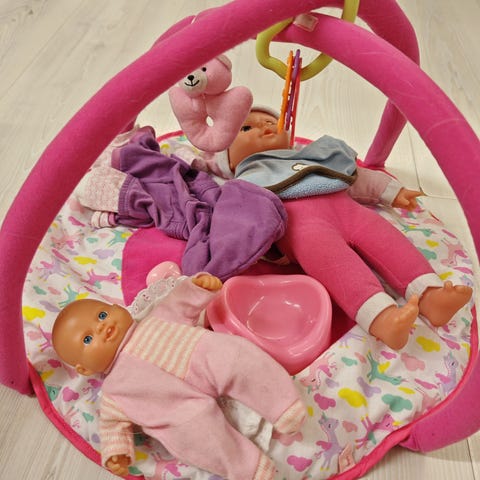 Nukke kantokopalla ja tarvikkeilla. Settiin kuuluu nukke, kantokoppa kantokahvalla, ruokalappu, paita, pieni nalle, potta, pieni laukku sekä body. Väriteema on pääosin vaaleanpunainen ja pastellisävyinen. Soveltuu nukkeleikkeihin ja lapsille.