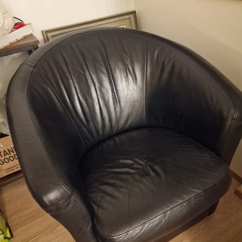 Luonnonvalkoinen nahkainen Ikean Alrid nojatuoli. Poistunut mallistosta jo aikoja sitten, mutta nojatuolilla on ajaton design.