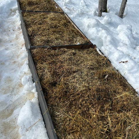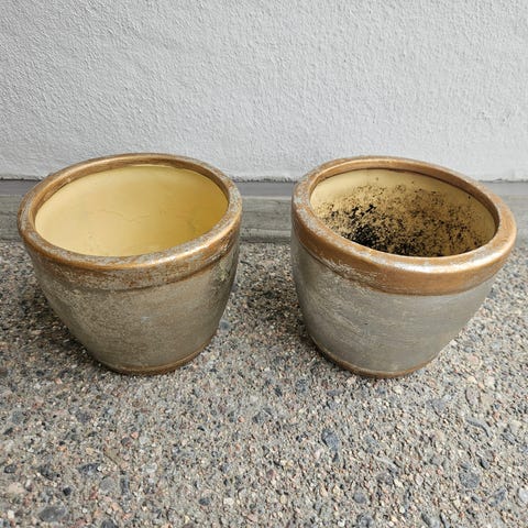 Erilaisia kukkaruukkuja,osa sisällä ja osa ulkona,joissa multaa
