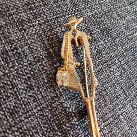 Myydään siro ja elegantti kullansävyinen rintaneula. Korussa on yksi suurempi kirkas kivi ja kolme pientä strassia, jotka tuovat kaunista loistoa. Klassinen muotoilu sopii täydellisesti jakkuun, takkiin tai huiviin.