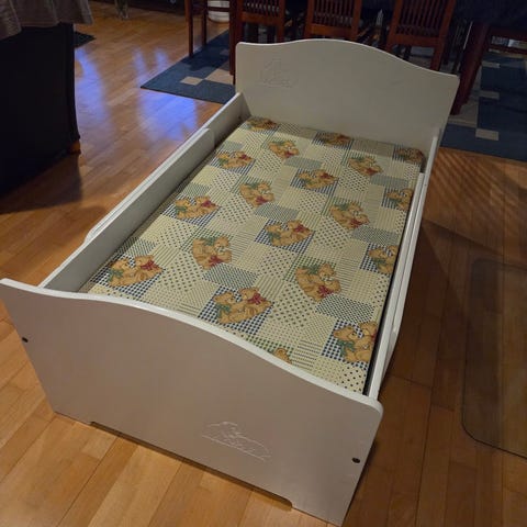 Valkoinen sänky. 183 * 97 leveys * 77 korkeus, päädyn leveys 60cm. Sänky kavennettavissa, kapeimmillaan n. 70cm. Molemmille leveyksille löytyy patja.