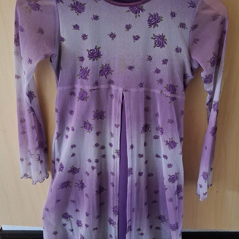 Hihaton tyttöjen mekko, koko 158. Violetti väri ja perhoskuviointi kauttaaltaan. Valmistettu polyesteristä. Selässä vetoketju vyötärölle asti. Pituus noin polven tienoille. Sopii arki- ja juhlakäyttöön vuodenaikojen mukaan esimerkiksi neuletakin tai pitkähihaisen paidan kanssa yhdistettynä.