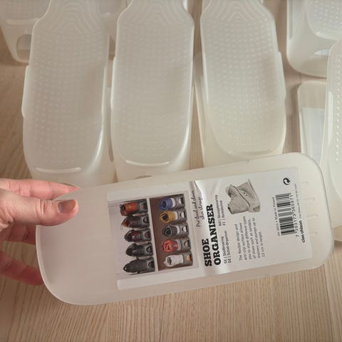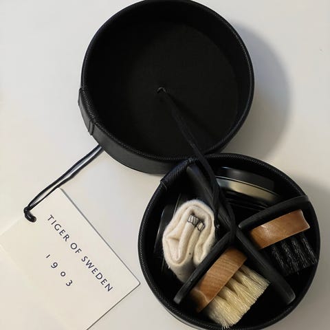 & Other Stories kenkätukipuut ja hoitosetti. Settiin kuuluu puinen kenkätukiparI koossa; sopii kaikenkokoisiin kenkiin (jousilestit). Kaksi erilaista kenkäharjaa, kenkävoiteita; musta ja neutraali sekä säilytyspussi. Sopii nahka- ja muiden kenkien muodon ylläpitoon ja puhdistukseen.