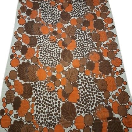 # retropöytäliina, vintagepöytäliina, retroliina, vintageliina, 1970, 70-luku, 70-lukua, 70-luvun, vintagea, retroa, oranssi, ruskea, kuviollinen