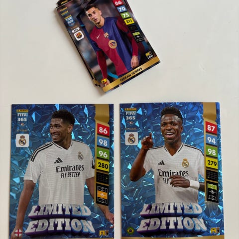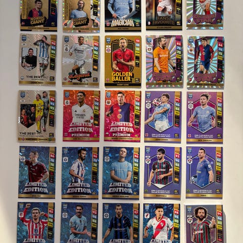 Panini FIFA 365 jalkapallokortit erä. Korteissa on eri pelaajia ja erikoiskortteja, kuten Limited Edition- ja Signature-kortteja. Mukana muun muassa maalivahteja ja kenttäpelaajia eri seuroista. Kortit on säilytetty muovitaskuissa kansiossa. Soveltuu kokoelman täydentämiseen tai harrastuksen aloittamiseen.