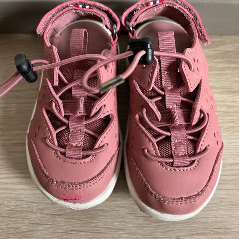 Viking lasten sandaalit, koko 23. Unisex-malli, jossa roosa päällinen ja vaalea pohja. Sandaaleissa on säädettävä tarrakiinnitys kantapäässä ja kiristysnyöri jalkapöydän päällä istuvuuden säätämiseksi. Päällinen on osittain umpinaisempi ja sivuilla on aukot ilmavuutta varten. Pohjassa on kuvioitu pinta pidon parantamiseksi. Soveltuu arkeen ja ulkoleikkeihin lapsille. Sisämitta 13,2cm.