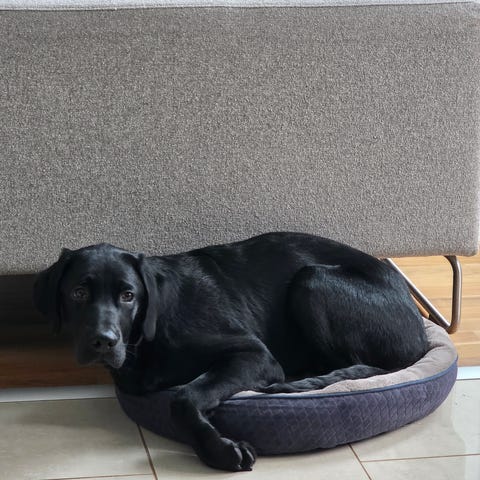 Scruffs koiranpeti, pyöreä malli. Yläosa pehmeää, beigeksi värjättyä kangasta, sivuilla vaaleanpunainen reunus ja pohjassa tumma, karhea kangas, joka auttaa pitämään pedin paikallaan lattialla. Sopii pienille koirille tai muille pienille lemmikeille lepäilyyn ja nukkumiseen sisätiloissa.