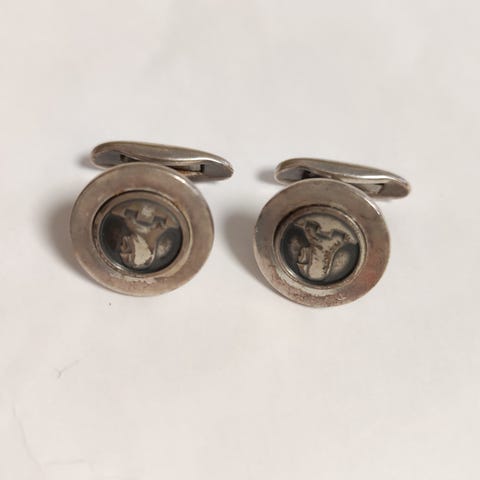 Vanhat hopeiset kalvosinnapit. Toinen on korjattu aikanaan rautalangalla.